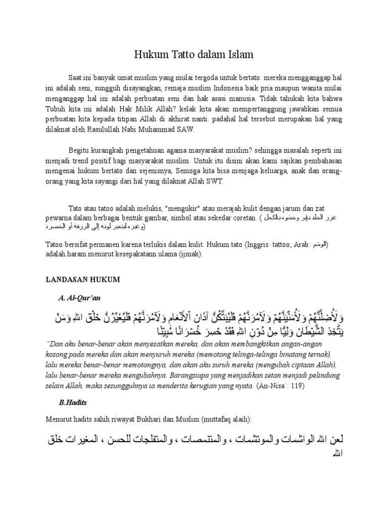 Sebab dalam proses membuat tato itu menyakiti diri sendiri dan mengubah pemberian Allah SWT. Hukum Bertato bagi Laki-Laki Menurut Islam Di atas sudah disinggung bahwa Islam ini telah mengharamkan tato dan mengharamkan perbuatannya. Tato merupakan tindakan memasukkan jarum halus dan zat-zat berwarna ke kulit.